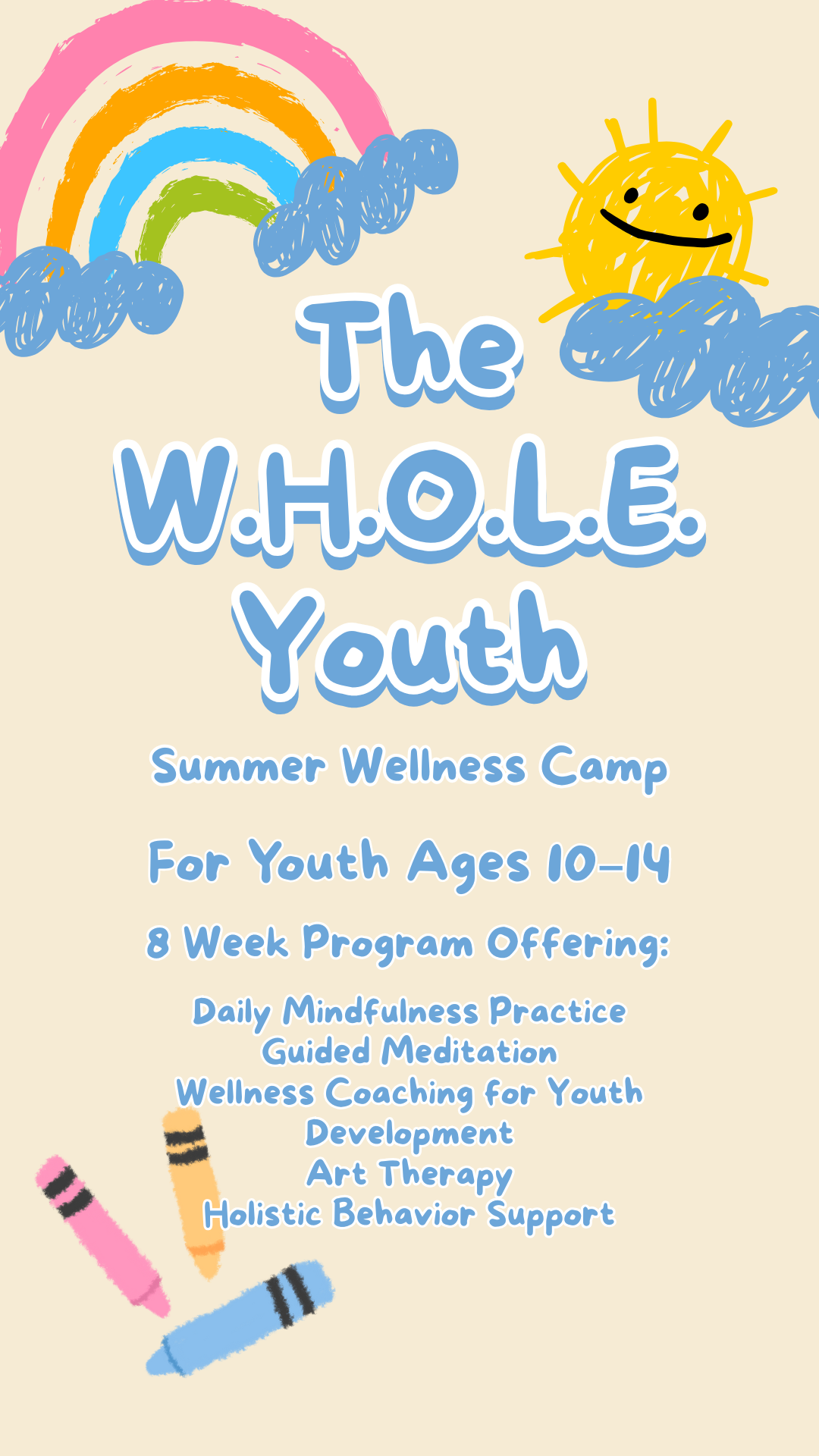 The W.H.O.L.E. Youth Summer Wellness Program is a private, community-based experience for youth ages 10–14, created by The W.H.O.L.E. You Inc. to support emotional well-being, confidence, and healthy development during the summer months.